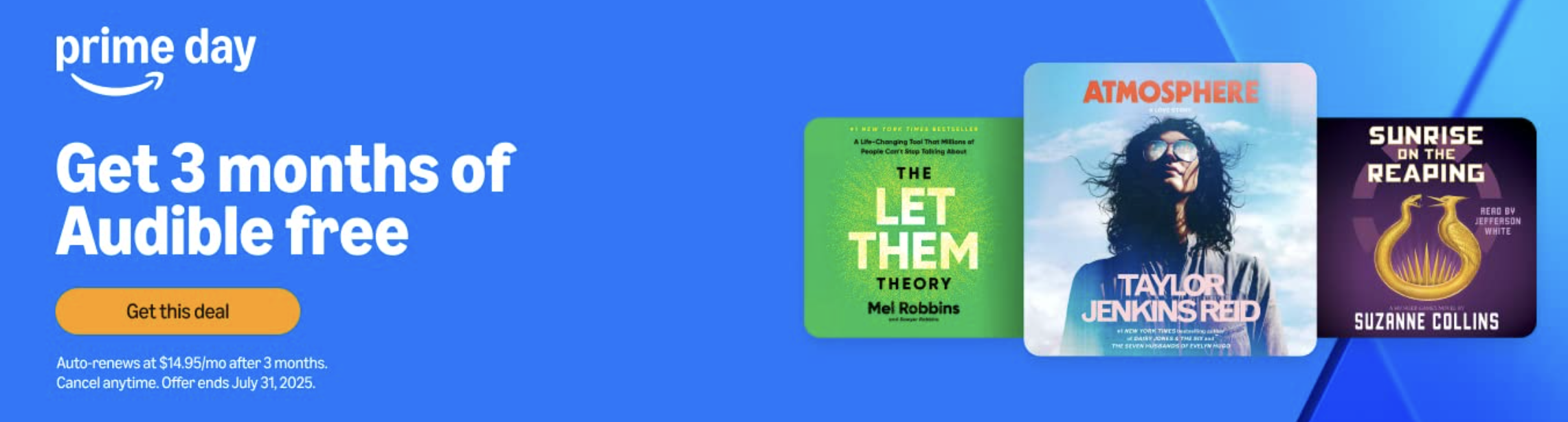 Audible prime day 超優惠,提供3個月免費。 (之後你可以選擇取消訂閱,或是回到正常價格繼續訂閱)除了每個月可以獲得一個購書點數去購買平台上任何一本有聲書,還可以在 Plus Catalog 、 Podcasts、Audible Originals 聽到飽。 如果你之前一直在猶豫到底要不要加入Audible,現在就是最好的時間加入來試試看這個訂閱是否適合。 這個特別的優惠只提供給 Amazon Prime Member。 建議可以先加入 Amazon Prime,體驗30天免費,到期再取消。